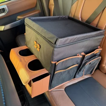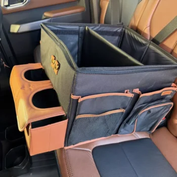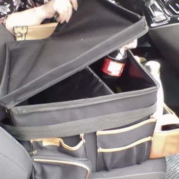 A large compartment with a removable divider, eight side pockets, and two front pockets can hold everything you need on the road—from drinks to gadgets. It is suitable for all car models and can be used in the front, back, or trunk seats. Plus, the lid works as a backseat table!