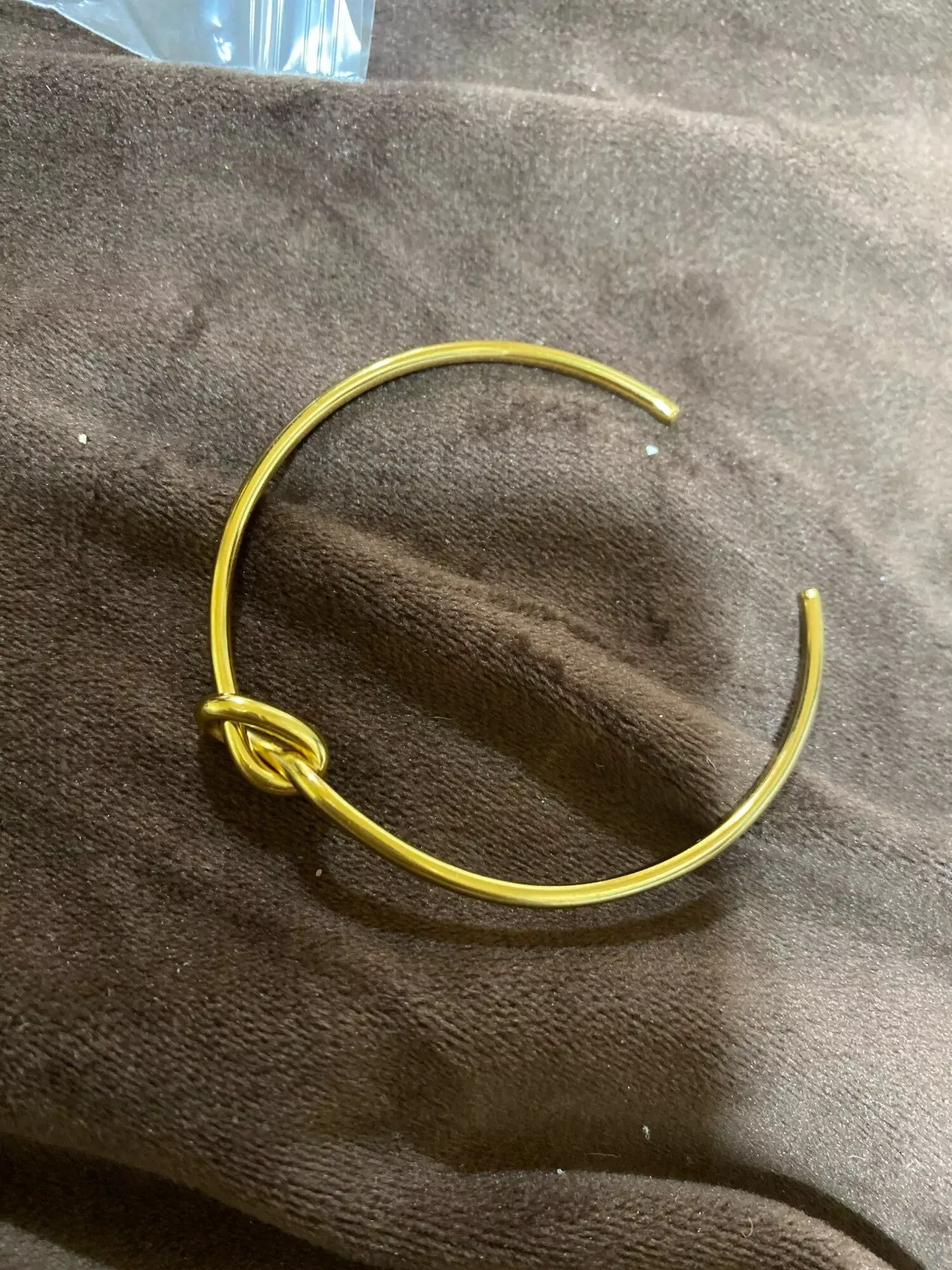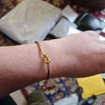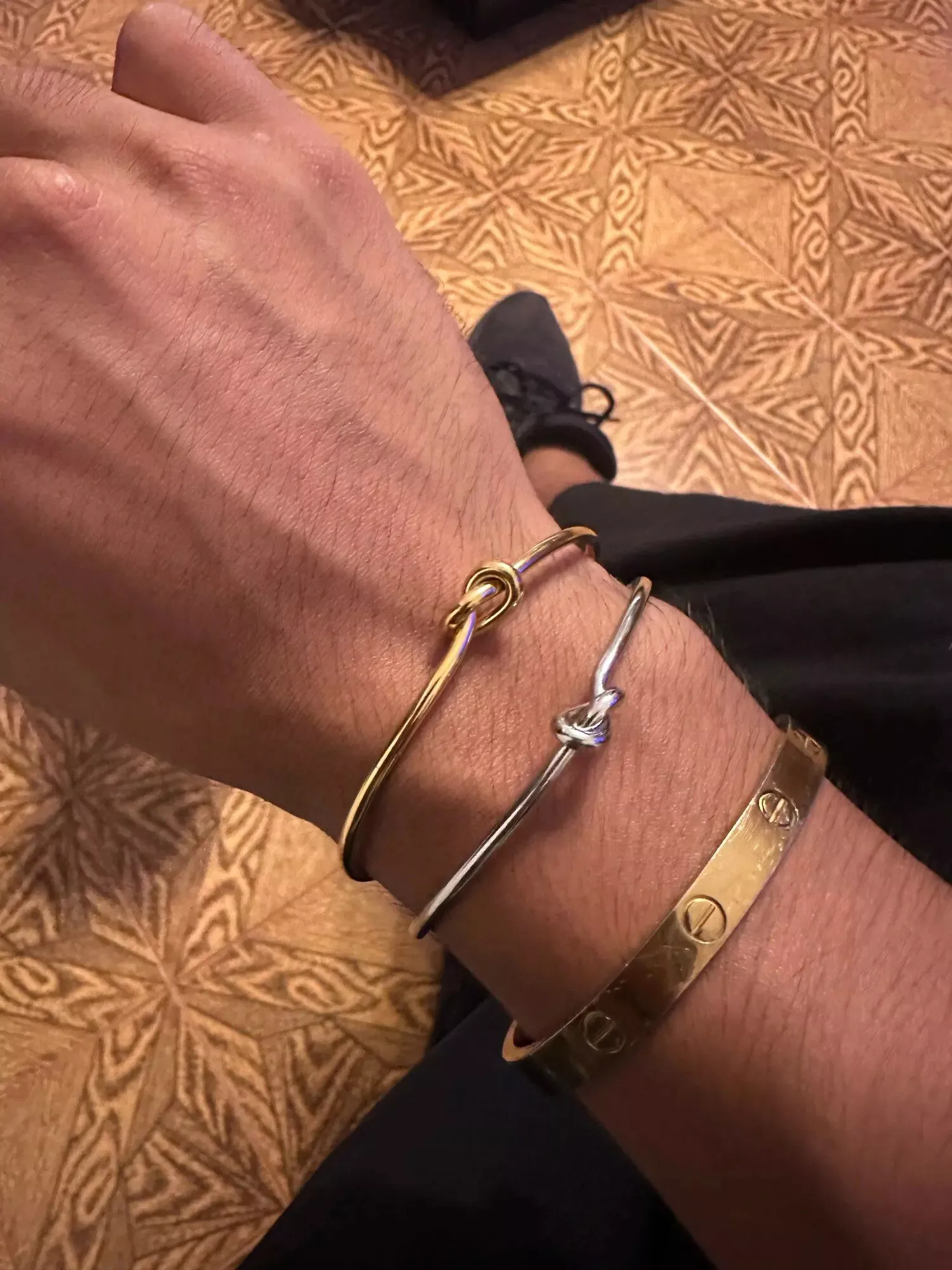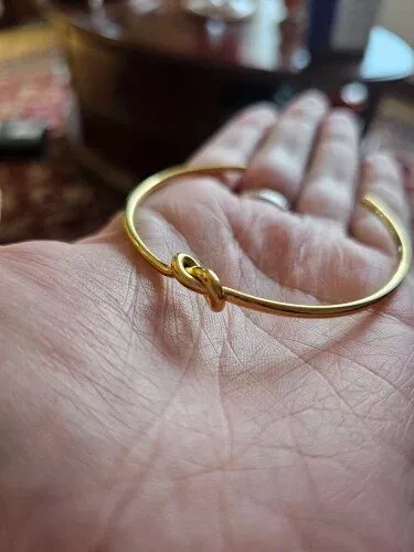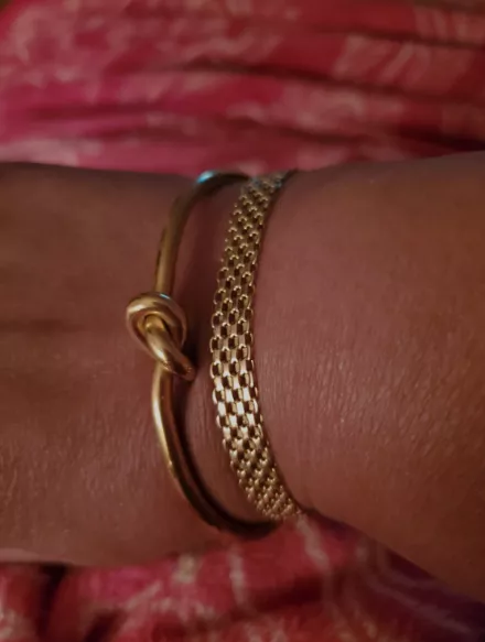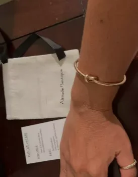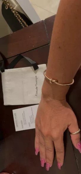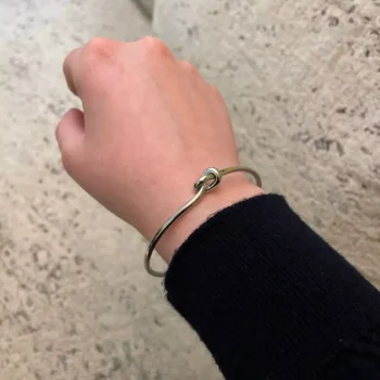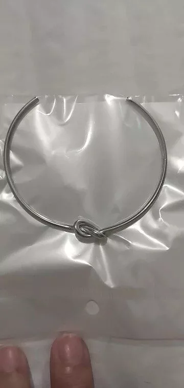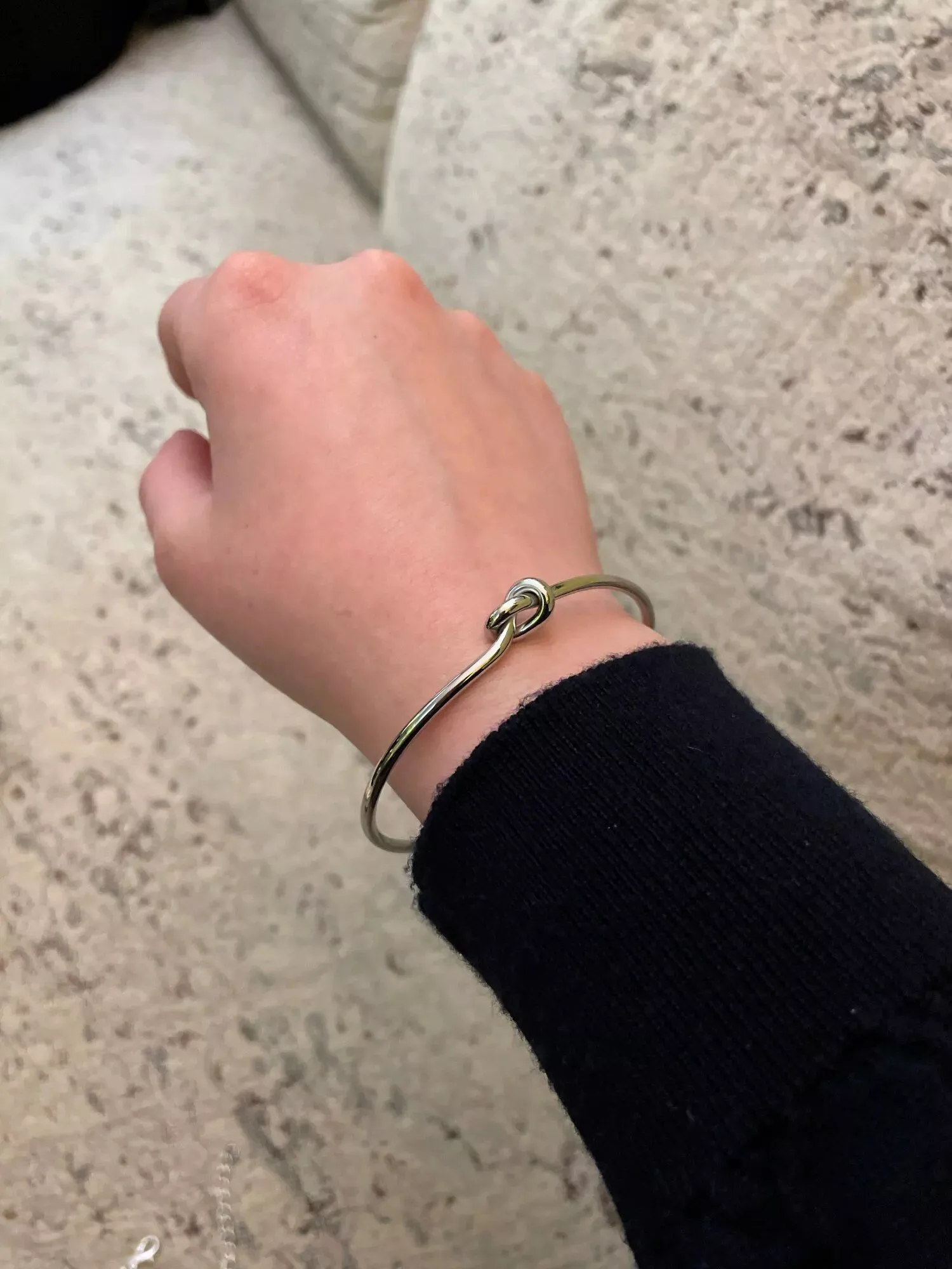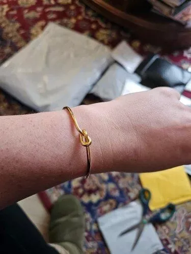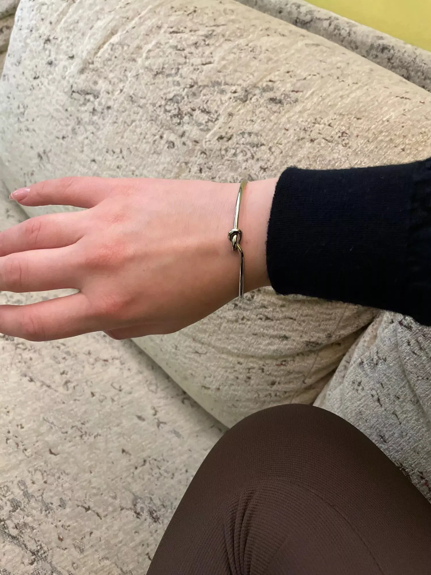 I'm fond of the bracelet's petite size, suitable for my small wrist. However, I'll overlook the slight gold tint near the knot and along part of the band, despite it being marketed as fully silver. It seems somewhat cheap, which likely explains the price.
