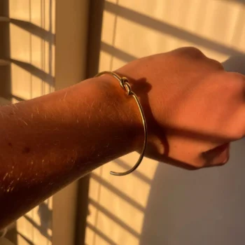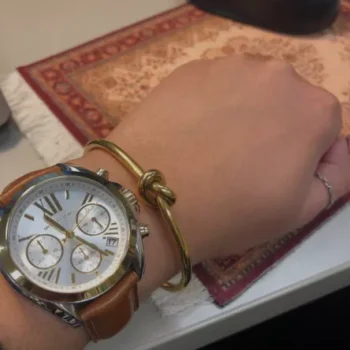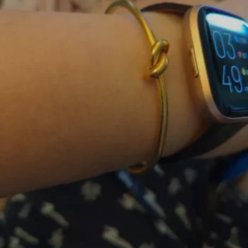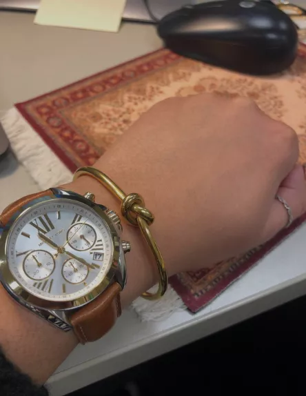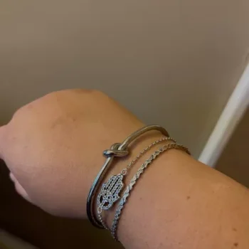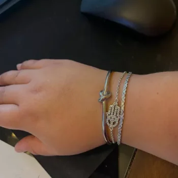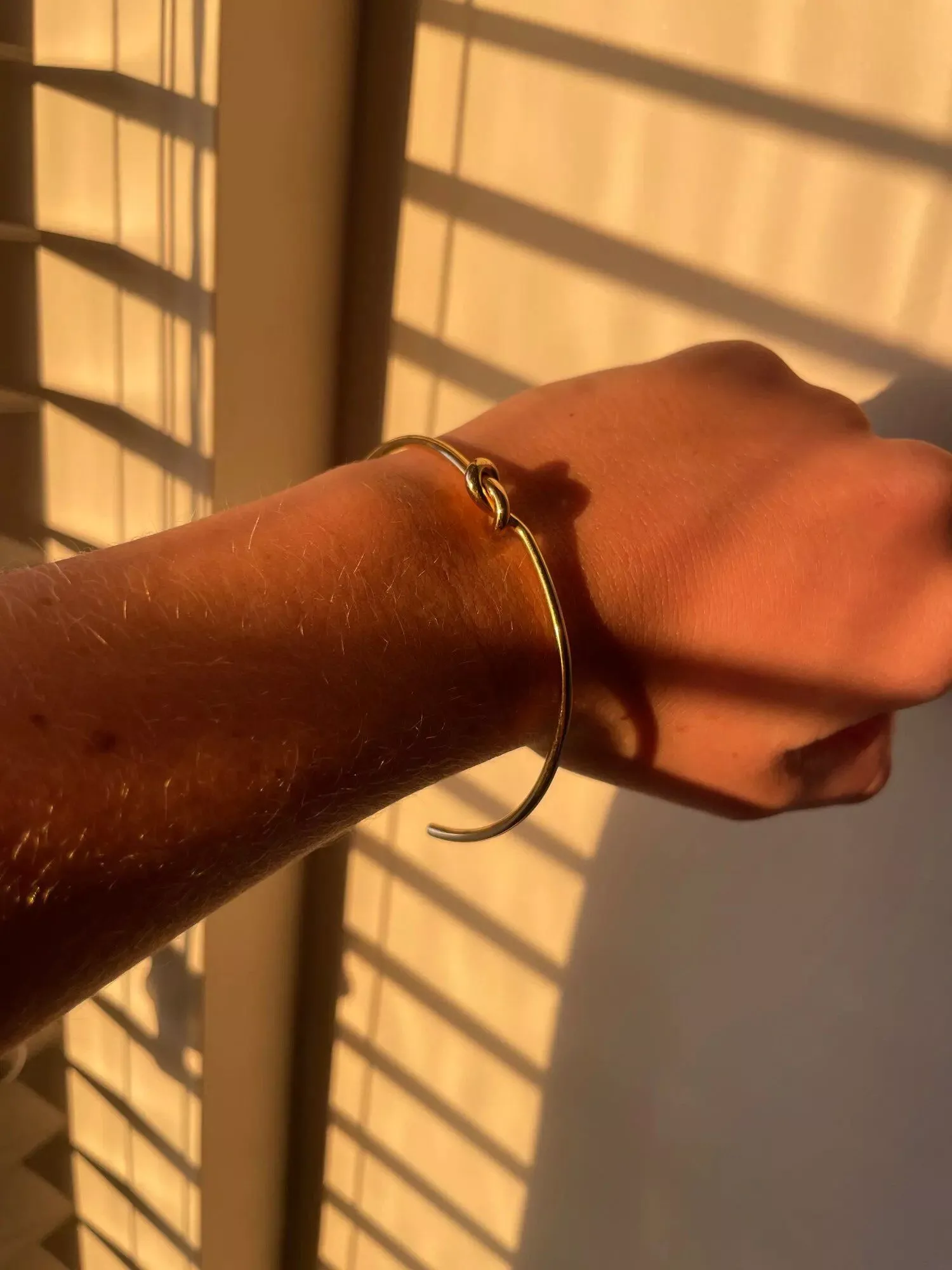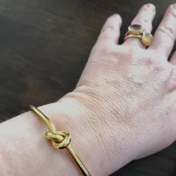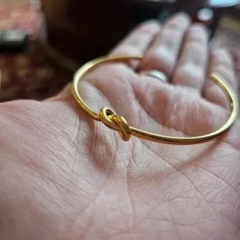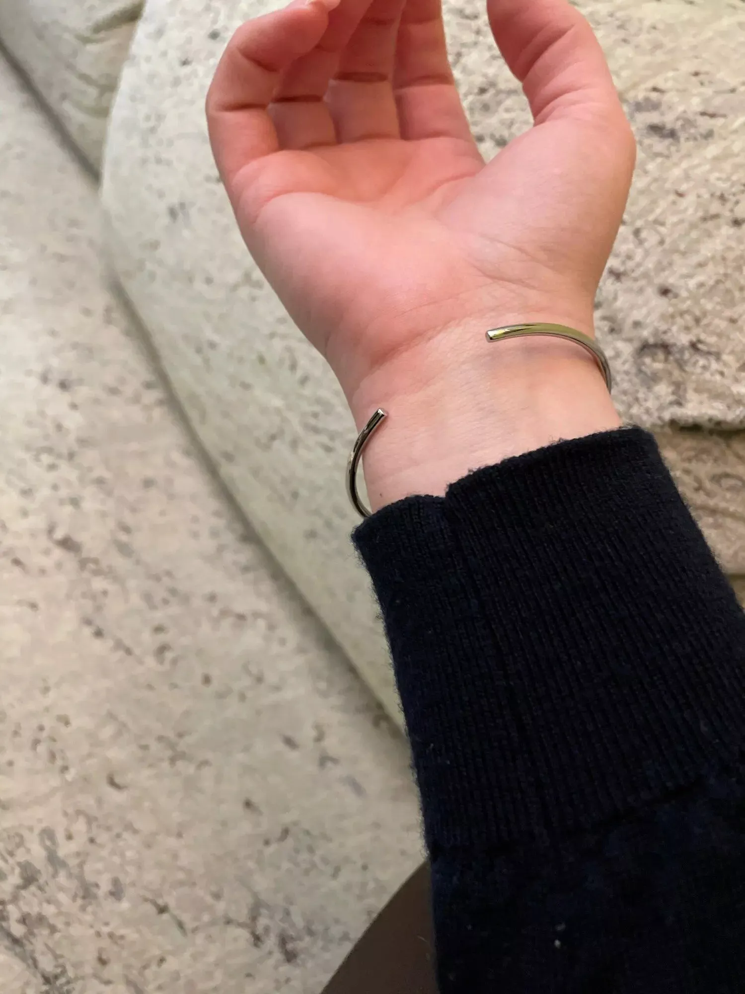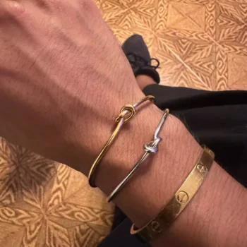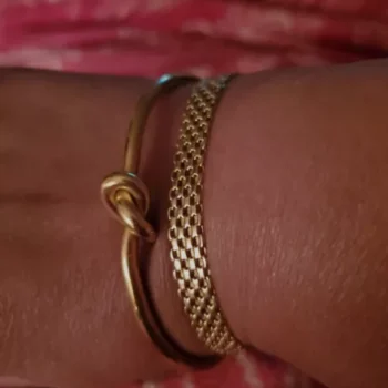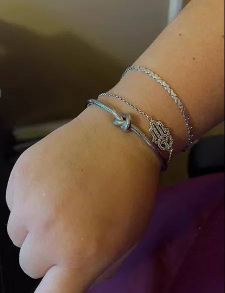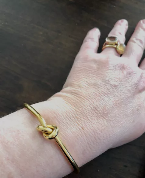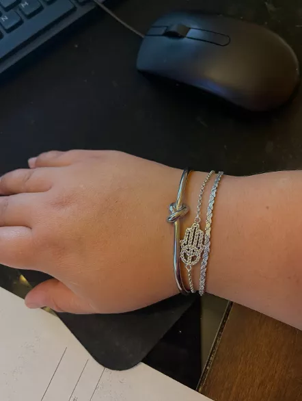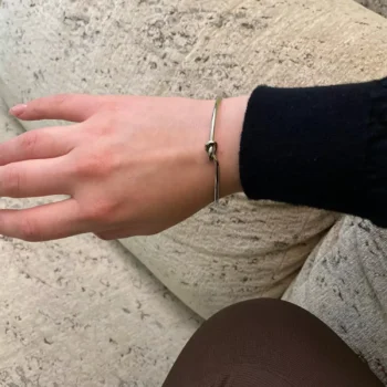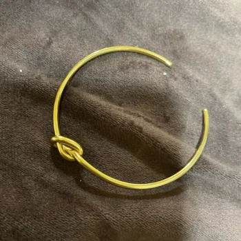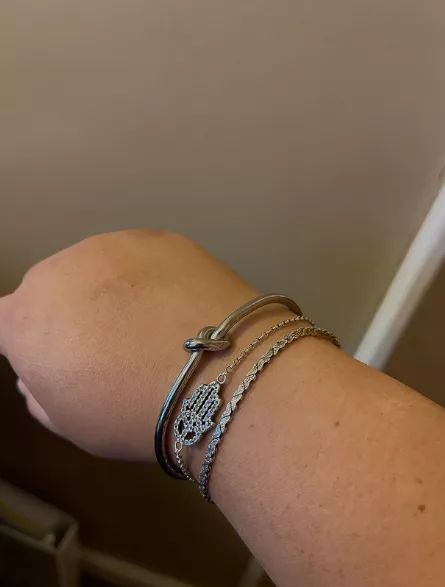 I'm fond of the bracelet's petite size, suitable for my small wrist. However, I'll overlook the slight gold tint near the knot and along part of the band, despite it being marketed as fully silver. It seems somewhat cheap, which likely explains the price.
